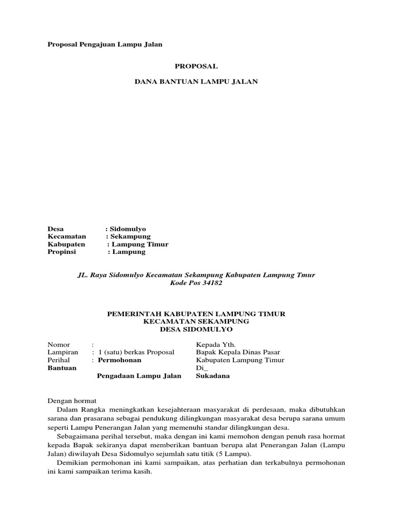 Proposal Permohonan Lampu Penerangan Jalan Umum Lukisan from imgv2-1-f.scribdassets.com Oleh karena itu, kami kelompok remaja pegadent (kordent) memohon bantuan lampu jalan karena sarana penerangan di desa srowot khususnya rt 01 rw 04 dan rt 02 rw 04 masih kurang. Berikut ini adalah contoh format proposal permohonan bantuan pembagunan jalan lingkungan desa. P r o p o s a l pembangunan jalan lingkungan kp. Lampu bunga surya waterproof hyacinth garden light outdoor dekoratif 3 lampu led untuk penerangan lanskap jalan masuk jalur teras rumput. Disampaikan dengan hormat, untuk keamanan dan ketertiban khususnya para pengguna jalan pada waktu malam hari, di wilayah desa contoh, ternyata sangat minim akan lampu penerangan jalan, maka dari itu kami mohon kepada bapak bupati untuk mengabulkan permohonan pemasangan lampu penerang jalan (lpju) yang ada di wilayah desa contoh kecamatan contoh. Untuk itu kami mohon di lokasi tersebut agar di pasang sebuah lampu mercury dengan kapasitas 1000 watt. Apalagi jika berurusan dengan pembuatan acara kegiatan bakti sosial hingga urusan kedinasan. Contoh surat himbauan informasi seputar dunia militer dan.